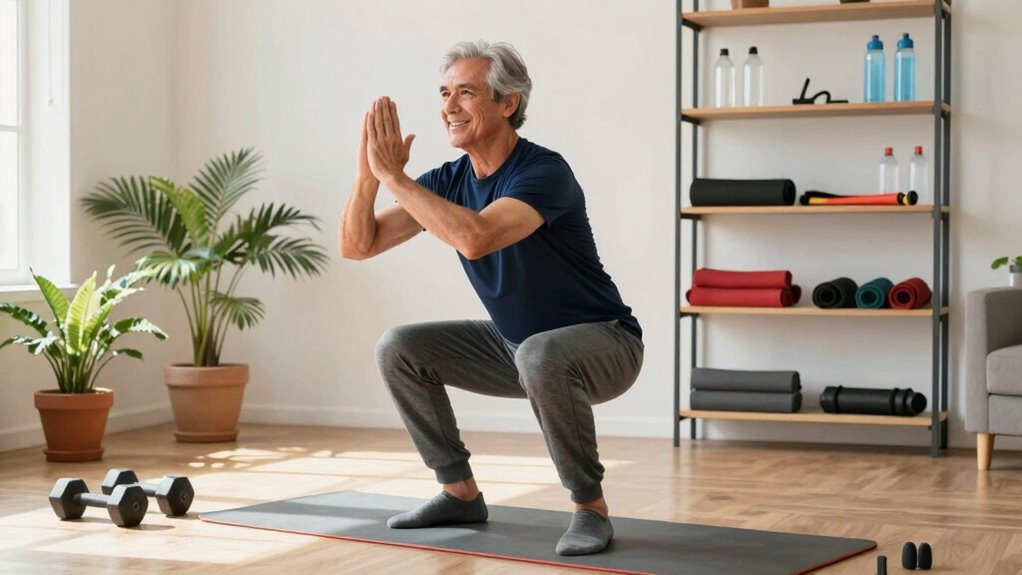 When choosing your exercises, prioritize movements that support your daily activities. Strength training is essential, but it should be tailored to avoid overexertion. Use light weights, resistance bands, or bodyweight exercises like squats and wall push-ups. Always start slow, focusing on proper form, and gradually increase intensity. This approach helps prevent injury and builds confidence in your routine. Incorporating balance exercises, such as standing on one leg or practicing tai chi, can considerably reduce the risk of falls, which become more common with age. Balance exercises also enhance coordination and stability, contributing to overall safety during physical activity.