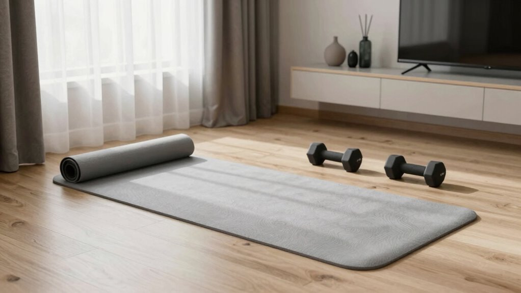 Did you know that noise complaints are among the top reasons apartment tenants seek soundproofing? For a quiet workout, choose noise-reducing mats with excellent vibration dampening and soundproofing solutions. Look for mats made of dense rubber or foam, designed specifically to absorb impact and cut down on noise transfer. These mats help protect your walls and floors, ensuring a quieter environment for both you and your neighbors.