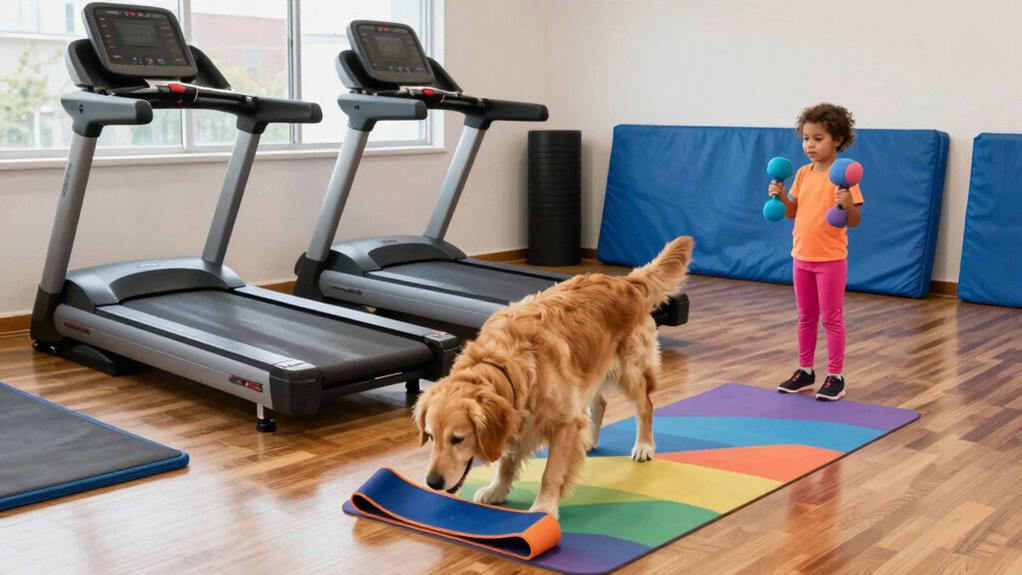 Certain fitness equipment, like treadmills and weight benches, pose more risks for pets and kids due to their moving parts and open spaces. Regular equipment maintenance helps prevent accidents, while pet-friendly modifications, such as safety covers and barriers, keep little ones and pets safe. Always supervise use, store equipment securely when not in use, and guarantee the area is child- and pet-proofed to minimize hazards effectively.