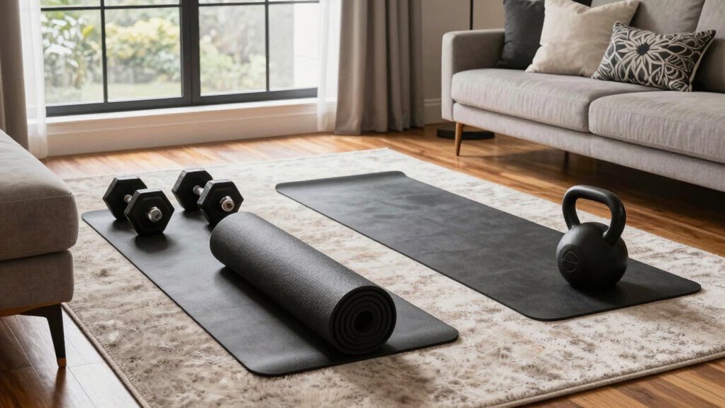 This flexibility ensures you can perform heavy training without sacrificing your interior design. Portable, modular options provide convenience and protection, letting you focus on your workout instead of worrying about floor damage.