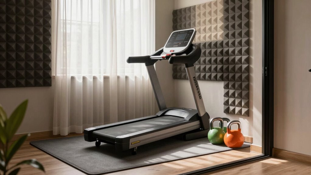 Adding noise-absorbing materials can substantially reduce sound transfer during your workouts. You might consider using thick rubber mats, hanging sound-absorbing panels, or installing insulation barriers. These simple steps help create a quieter, more focused workout environment.