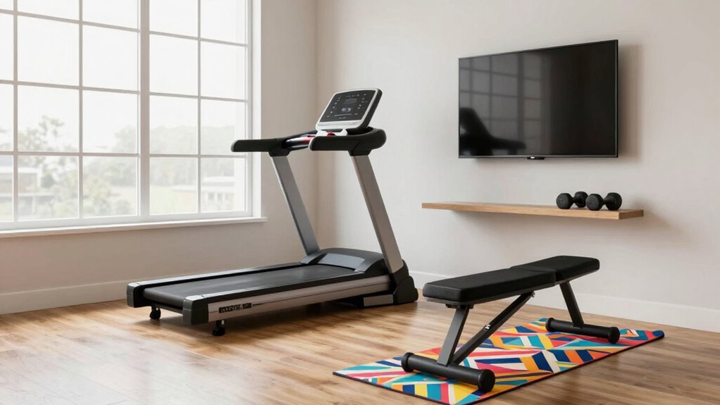 You might think bulky gym equipment takes up too much space, but with clever storage, you can maximize your area. Use wall-mounted racks or hooks for weights and resistance bands, stack items vertically, and invest in multi-purpose furniture like storage ottomans. Consider foldable or collapsible equipment that can be tucked away when not in use. These tips help keep your living room organized without sacrificing your workout space.
