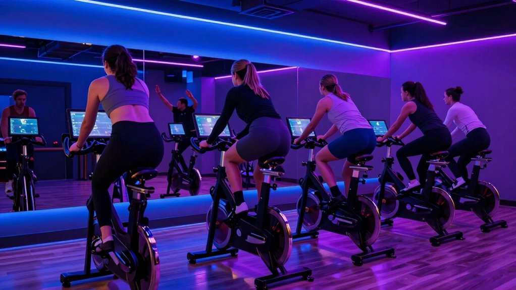 A tempo ride is a focused indoor cycling session where you maintain a steady effort at your sweet spot — around 75-85% of your max heart rate. This intensifies your aerobic capacity, builds endurance, and improves efficiency without causing excessive fatigue. You’ll ride comfortably yet challenging enough to push your limits. When you keep consistent effort throughout, you develop mental toughness and pacing skills. Keep going to discover detailed tips that will help you maximize your tempo training.