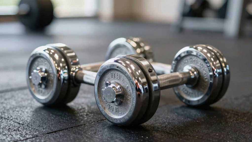 Before selecting a dumbbell weight, it’s important to honestly assess your current fitness level. Think about how often you exercise and the types of workouts you’ve done recently. Are you new to strength training or returning after a break? Do you experience any pain or discomfort during physical activity? Be honest about your endurance and muscle strength. If you’re unsure, start with a lighter weight to test how it feels during exercises. Avoid jumping straight to heavier weights, as this can lead to poor form or injury. Remember, choosing a weight that’s too heavy can hinder progress and cause strain. Taking the time to evaluate your fitness ensures you pick a weight that challenges you without risking injury. Additionally, understanding the horsepower of electric dirt bikes can help you recognize the importance of starting with manageable resistance to prevent overexertion. Building a solid foundation with appropriate weights mirrors the benefits of easy cleanup with water-based paints, making your fitness journey smoother and more sustainable. Recognizing your current strength helps prevent overexertion and injury, ultimately supporting ongoing progress and safe workout practices. A gradual increase in weight can also improve your muscle endurance over time, ensuring steady improvements without setbacks.