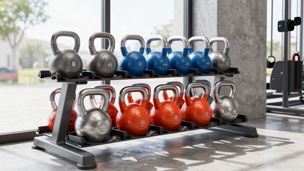 Maximizing space is essential in a garage gym, especially when it comes to storing adjustable kettlebell sets. I recommend choosing a compact design that saves room and fits easily into your setup. Look for models with a flat or stable base to prevent tipping, making storage safer and more convenient. Quick adjustment mechanisms help minimize downtime, so your workout isn’t interrupted by fiddling with weights. Storage features like integrated racks or designated compartments keep everything organized and accessible, reducing clutter. Lightweight and ergonomic designs also make handling easier, ensuring you can move and store them without taking up extra space. Prioritizing these factors helps create a clean, efficient workout area where your equipment is both accessible and unobtrusive.