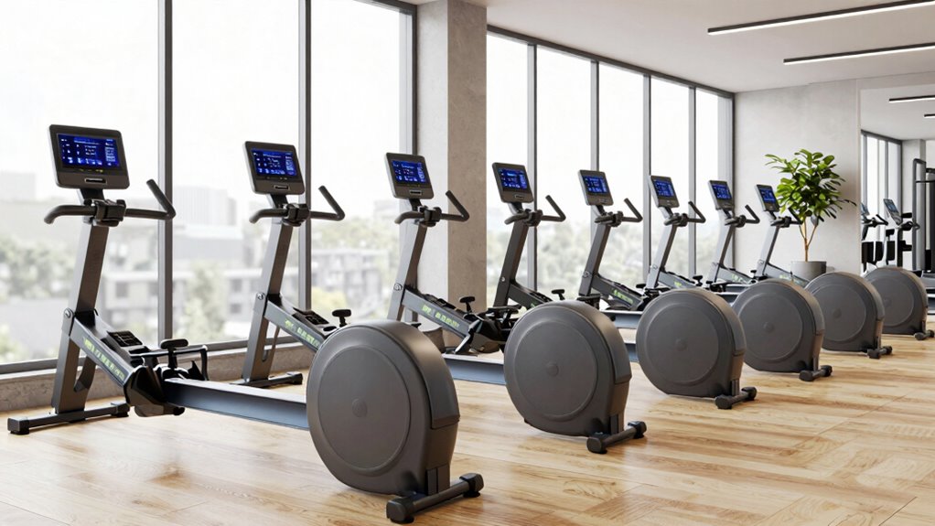 These air rowing machines are surprisingly quiet during operation, often quieter than I expected. The swoosh of the fan and smooth glide create a gentle hum, almost soothing. You’ll hear a soft whoosh with each stroke, but it’s far from loud or disruptive. Perfect for apartments, they let me work out without disturbing my neighbors. It’s like having a personal gym soundscape—peaceful, efficient, and surprisingly silent.