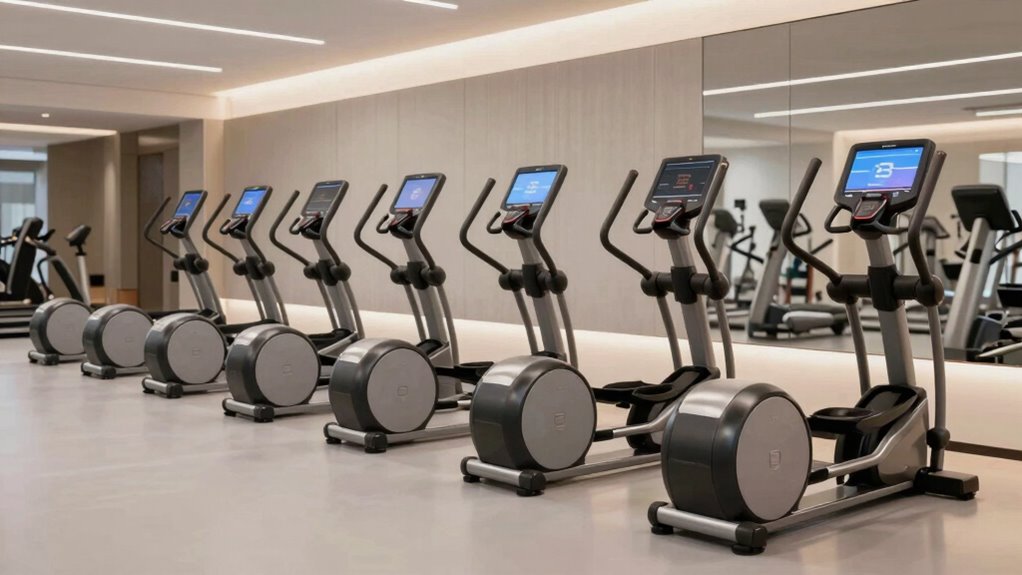 Choosing a commercial elliptical under $2000 means paying close attention to resistance levels and types, as they directly affect workout variety and intensity. Most models feature magnetic resistance systems, which provide smooth, quiet operation suitable for different workout intensities. Resistance levels typically range from 8 to 32, giving you options from gentle recovery sessions to high-intensity training. Many ellipticals include adjustable resistance settings that can be changed manually via tension knobs or electronically through digital controls, offering precise control. Some models also offer incline or variable resistance options, adding versatility for hill climbing or interval workouts. The number and type of resistance levels substantially impact workout customization and overall machine versatility, ensuring you can tailor your training to meet your fitness goals effectively.