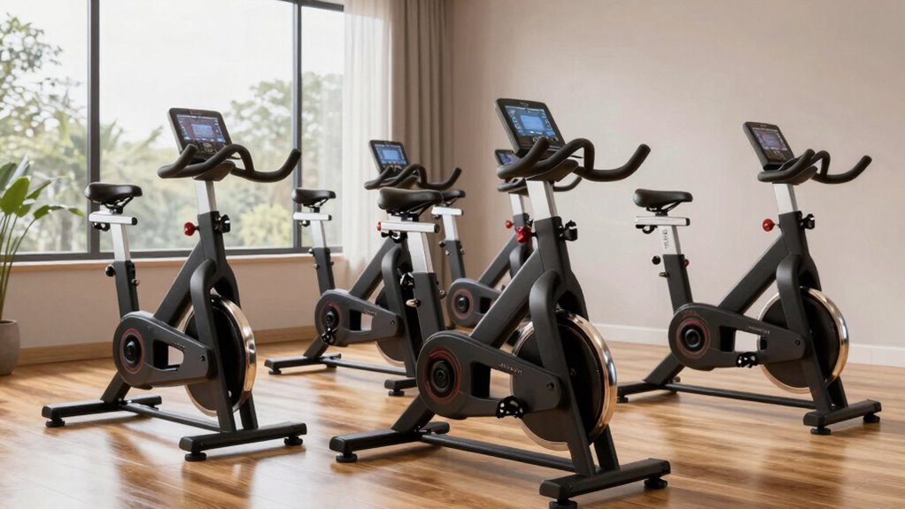 Most indoor cycling bikes under $800 can support up to 250 to 350 pounds, which I find to be quite impressive given their affordability. I always check the weight capacity to guarantee safety and durability before purchasing. It’s crucial to pick a bike that matches your weight to avoid strain on the equipment. Remember, choosing a sturdy bike with a higher weight capacity can give you peace of mind during your workouts.
