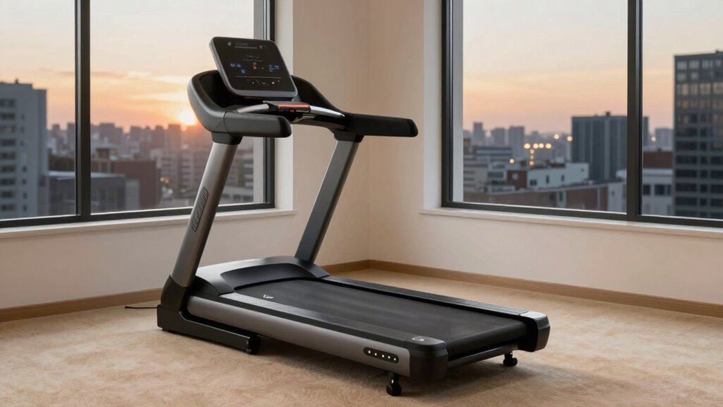 When choosing a treadmill for apartment living, operational quietness is crucial to avoid disturbing neighbors and maintain a peaceful environment. Treadmills with noise levels below 45 decibels are ideal, as they won’t disrupt your household or neighbors. Brushless motors are a great choice because they produce less noise than brushed motors, keeping your workouts quieter. Incorporating multi-layer shock absorption and cushioning systems not only protects your joints but also reduces noise during impact. Proper maintenance, like lubricating the belt and checking components regularly, ensures the treadmill stays quiet and runs smoothly. Additionally, selecting models with low maximum decibel ratings and features like external cooling fans can further minimize operational noise, creating a more comfortable and unobtrusive workout space in your apartment.