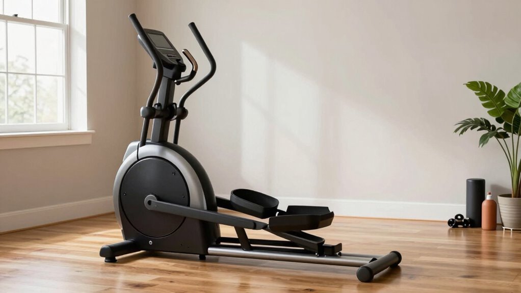 Choosing a compact elliptical with effective monitoring and display tools can substantially enhance your workout experience. A clear LCD monitor that shows real-time metrics like time, speed, distance, calories burned, and heart rate helps you stay focused and motivated. Advanced features, such as pulse sensors on handlebars or wireless heart rate monitors, provide accurate biometric tracking. Some models even display additional data like BMI, body fat percentage, and BMR, allowing you to tailor your fitness plans more effectively. Multiple feedback tools, such as progress graphs and goal-setting options, keep you motivated by tracking your improvements over time. Compatibility with fitness apps or Bluetooth-enabled devices can further enrich your workout, offering interactive and all-encompassing monitoring options to support your fitness journey.