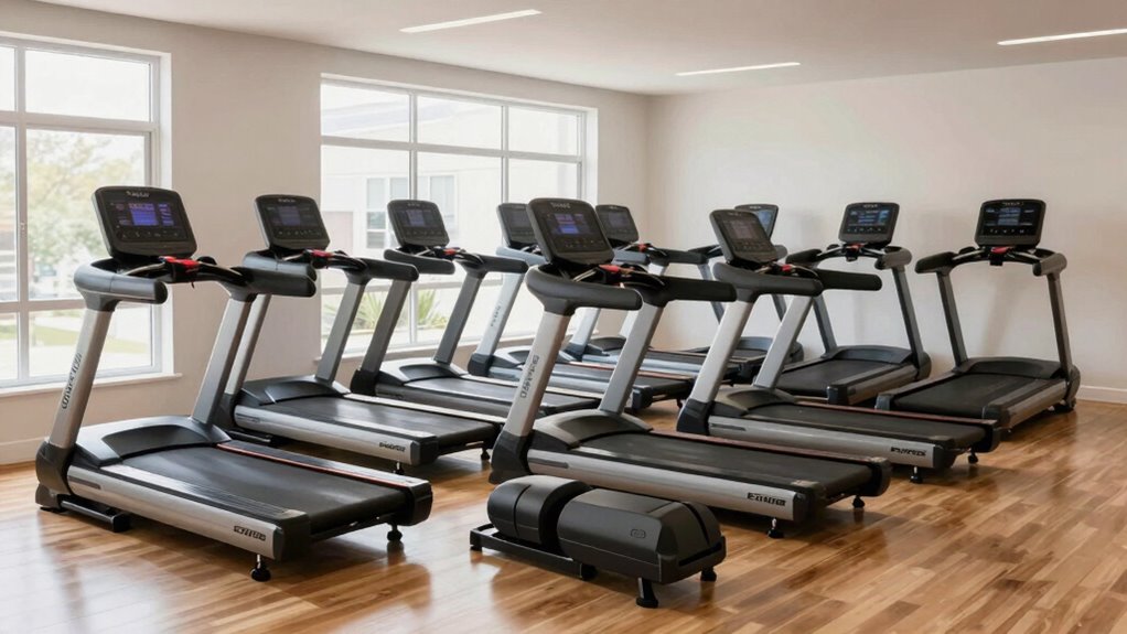 Ensuring safety and stability is essential when selecting a folding treadmill, especially since it needs to support your workouts reliably in a compact form. A stable treadmill features a wide, non-slip running surface with textured grips to prevent accidents. Look for models with a sturdy frame and reinforced joints that can safely support up to 300 lbs or more. Safety mechanisms like secure locking systems for folding and unfolding keep the treadmill stable during use. Shock absorption systems and anti-vibration technology minimize wobbling and noise, making your workouts safer and more comfortable. Additionally, secure handrails or side supports provide extra stability, especially if you need help balancing. Prioritizing these features guarantees your treadmill remains safe and reliable throughout your fitness routine.