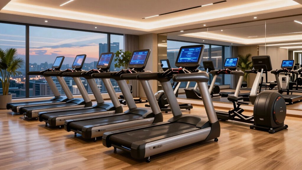 Seamless connectivity and app integration considerably enhance the overall workout experience on an incline trainer treadmill. I look for Bluetooth or Wi-Fi options to sync with fitness apps effortlessly and track my progress accurately. Compatibility with platforms like Apple Health, Garmin, Strava, or Zwift is a big plus, allowing me to consolidate data and stay motivated. I also check if the treadmill supports app control, so I can adjust speed, incline, or switch programs remotely—making workouts more convenient. Features like virtual routes, scenic workouts, or AI coaching through the app can boost motivation and keep things interesting. ultimately, I consider whether the app services are free or subscription-based and if they offer detailed analytics and personalized plans to help me reach my fitness goals.