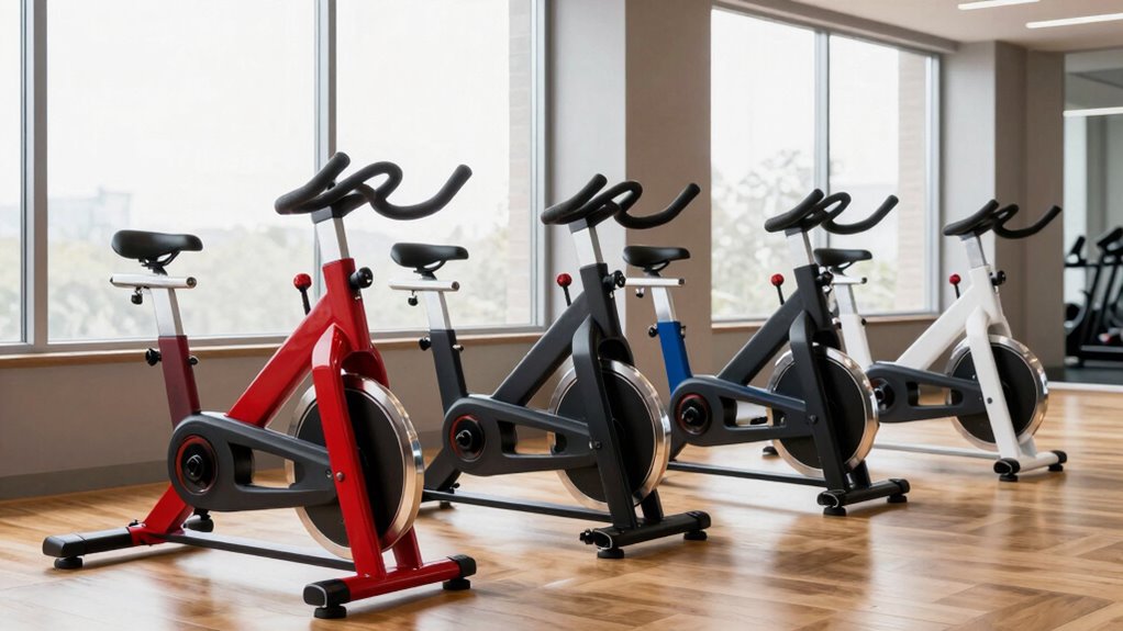 Building a stable, durable indoor cycling bike hinges on its construction quality. A sturdy frame made of reinforced or alloy steel ensures the bike remains stable during intense workouts. A low center of gravity and a broad, reinforced base prevent wobbling and tipping, making your ride safer. Heavy-duty flywheels, around 30 to 45 pounds, help achieve smoother pedaling and added stability. Non-slip, adjustable rubber feet or leveling knobs are vital for stabilizing the bike on uneven surfaces and preventing unwanted movement. Additionally, a proper weight capacity and high-quality materials are essential to support users of all sizes without sacrificing balance or safety. When these elements come together, you get a reliable, stable bike that can endure rigorous use and offer a safe workout environment.