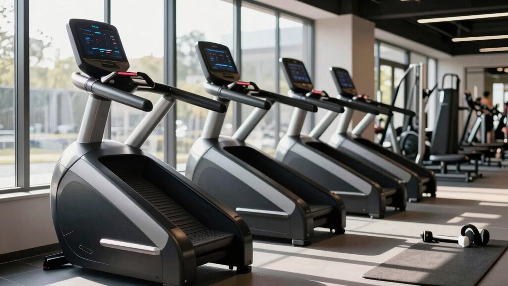 Top-rated stair climbers include safety features like sturdy handrails for support, non-slip pedals to prevent falls, and emergency stop buttons for instant shutdown. Many also have adjustable speeds to match your fitness level and built-in sensors to monitor your heart rate. I always look for machines with clear display panels and safety certifications, so I feel secure during my workouts. These features help me stay safe and motivated while exercising.