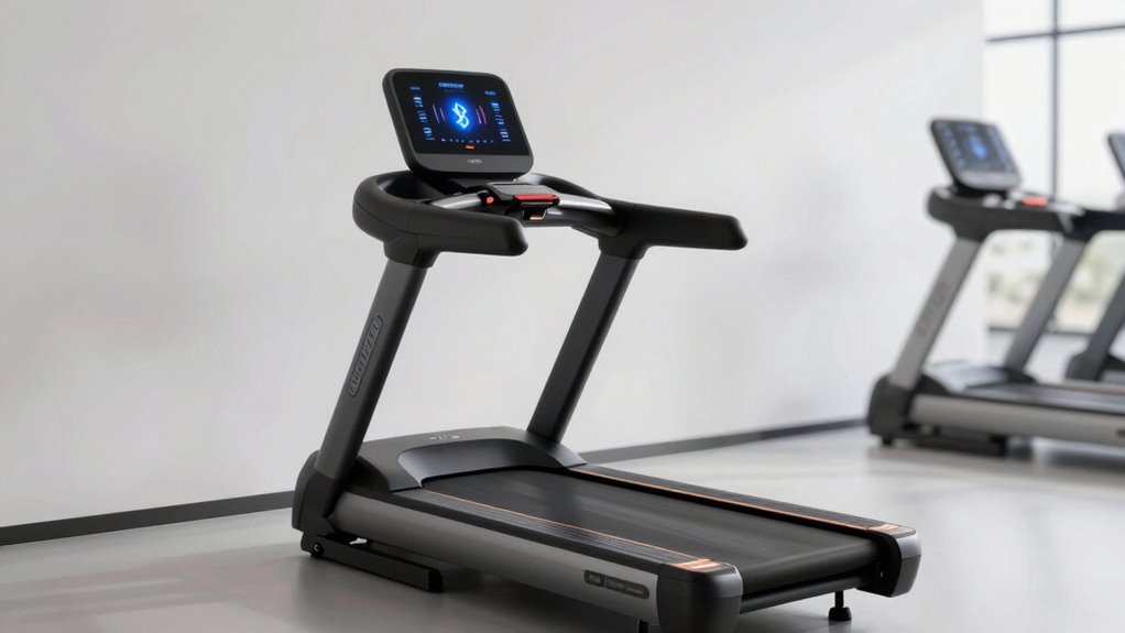 Smart tech and app control features considerably enhance the treadmill experience by making workouts more interactive and personalized. Bluetooth connectivity lets you seamlessly pair your treadmill with fitness apps, giving real-time data tracking and analysis. Many models support remote control functions, so you can adjust speed and incline directly from your smartphone or tablet, keeping your focus on your workout. App compatibility is another big plus, offering personalized training plans, virtual coaching, and interactive sessions that keep you motivated. Built-in speakers enable music streaming, making workouts more enjoyable and energizing. Some advanced models even automatically sync workout metrics with platforms like Apple Health, Garmin, or Strava, providing a thorough view of your fitness progress and helping you stay motivated and accountable.