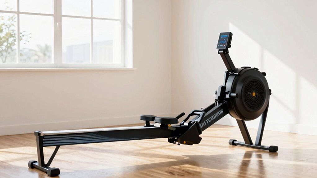 Since space can be limited in many home gyms, selecting a rowing machine with a space-saving design is essential for beginners. Compact models often feature foldable frames and vertical storage options, helping you maximize small areas. Many are under 70 inches long and can be stored upright or horizontally to keep your floor clear. Built-in transport wheels make moving and storing these machines simple, so you can easily tuck them away after workouts. Slim profiles are designed to fit into tight spaces like apartments, bedrooms, or home offices without sacrificing workout quality. These space-efficient rowing machines use dual slide rails and minimal footprint layouts, providing a full-body workout while fitting neatly into confined environments. Choosing one guarantees you get effective exercise without cluttering your living space.