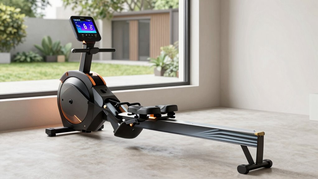 Since accurate workout data can greatly enhance your training, it’s vital to evaluate how well a rowing machine displays and tracks key metrics. A good machine should provide real-time data on distance, time, calories burned, stroke rate, and total strokes. These metrics help you monitor your performance and make adjustments during your workout. Compatibility with fitness apps is also essential, as it enables immersive features like virtual routes and personalized coaching. Seamless data synchronization via Bluetooth ensures your workout stats transfer smoothly to your devices. Detailed performance tracking supports goal setting and progress monitoring, keeping you motivated. Ultimately, the right data and metrics system can make your rowing sessions more effective, engaging, and tailored to your fitness journey.