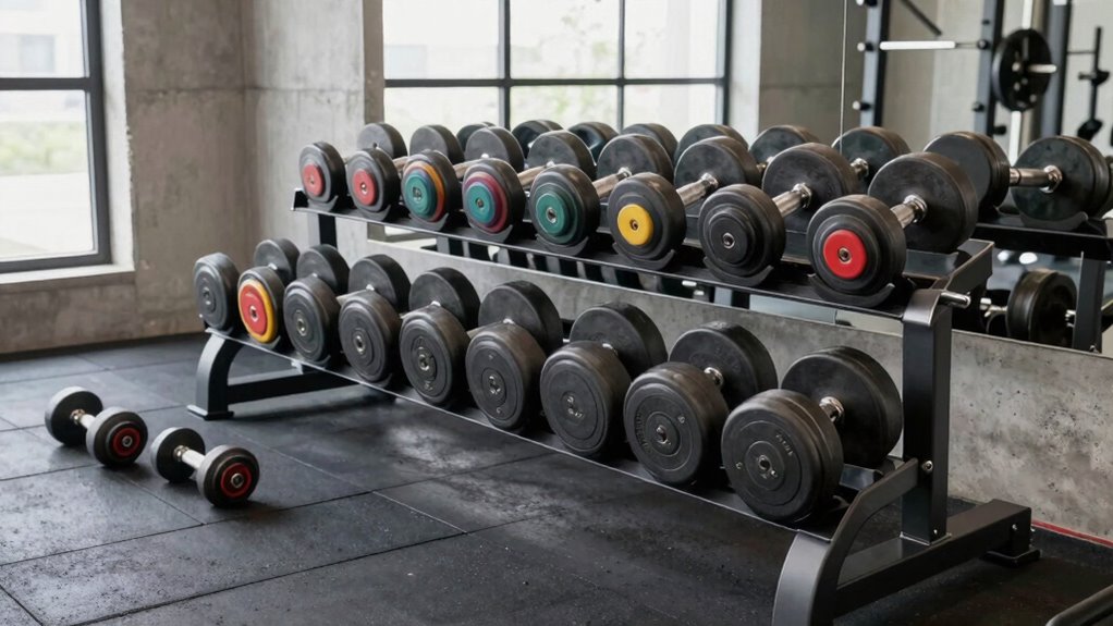 Adjustable dumbbells are like chameleons, transforming to fit your workout needs while keeping a compact profile. They’re typically smaller and more space-efficient than traditional sets, sliding neatly into a corner of your garage. With clever designs, they stack neatly or nest together, saving your precious space. I love how they turn a cluttered corner into a sleek, organized gym zone, making every inch count without sacrificing versatility or performance.