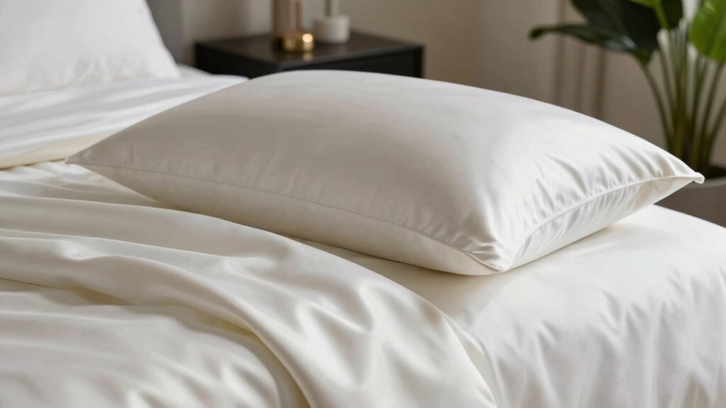 Maintaining your silk pillowcase’s delicate fibers requires careful attention to its care and maintenance. I recommend washing it with a pH-neutral detergent to avoid damage and preserve its softness. Hand washing or using a gentle cycle in cold water is best to keep the silk’s integrity intact. When drying, opt for shade or flat drying to prevent wrinkles and extend the pillowcase’s lifespan. Avoid bleach, fabric softeners, and dry cleaning chemicals, as they can weaken the silk and diminish its benefits. Regularly check stitches and zippers for wear, ensuring the pillowcase remains durable and fits securely. Proper care not only prolongs its lifespan but also helps maintain the silk’s smooth, beneficial surface for your hair and skin.