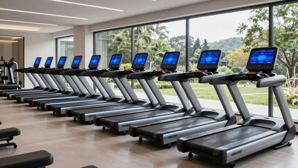 Budget-friendly smart treadmills include essential safety features like emergency stop buttons, safety keys, and automatic shut-off systems to prevent accidents. They also often have side rails for stability and non-slip belts for secure footing. I’ve found these features give me peace of mind during workouts, ensuring I stay safe while enjoying the convenience of smart technology. Safety doesn’t have to break the bank!