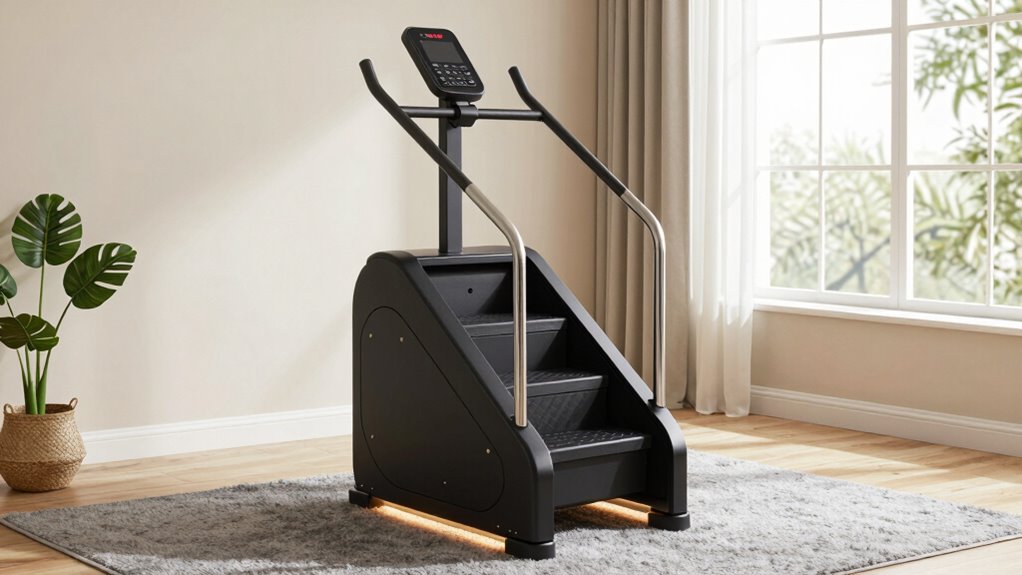 If space is limited, opt for a stair climber that folds flat to maximize storage efficiency. These models can reduce their footprint by over 70%, making them easy to tuck away behind doors, under beds, or in closets. Most foldable stair climbers feature quick assembly and disassembly, so you can set them up or stow them away in just minutes. Their compact designs typically measure under 20 inches in width when folded, perfect for small spaces. Lightweight construction, often under 30 pounds, adds to their portability, allowing you to move them effortlessly. Many models come with integrated handles or wheels, making transportation simple without needing extra tools. This foldability and ease of storage make them ideal for anyone tight on space.