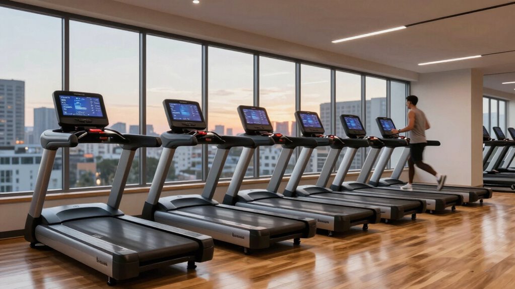 The maximum weight capacity of these treadmills ranges from 250 to 400 pounds. I always check this feature because it’s essential for durability and safety. For heavy runners like myself, I look for models supporting at least 300 pounds. This guarantees stability and longevity during intense workouts. Always verify the specific treadmill’s capacity before purchasing to make certain it matches your weight for safe, effective exercise sessions.