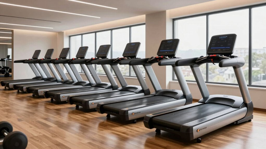 Connectivity and app integration are key features that can substantially enhance your treadmill experience. With app connectivity, I can access a variety of workout programs, scenic routes, and real-time tracking directly through my smartphone or tablet. Compatibility with fitness apps makes it easy to sync workout data, progress, and health metrics, giving me a thorough view of my fitness journey. Many models support Bluetooth or Wi-Fi, which ensures quick and stable data transfer. App integration also offers personalized coaching, virtual classes, and adaptive training plans that keep me motivated and engaged. Connecting to interactive platforms transforms treadmill workouts into more dynamic and enjoyable sessions. Overall, these features help me stay committed to my fitness goals while making workouts more convenient and motivating.